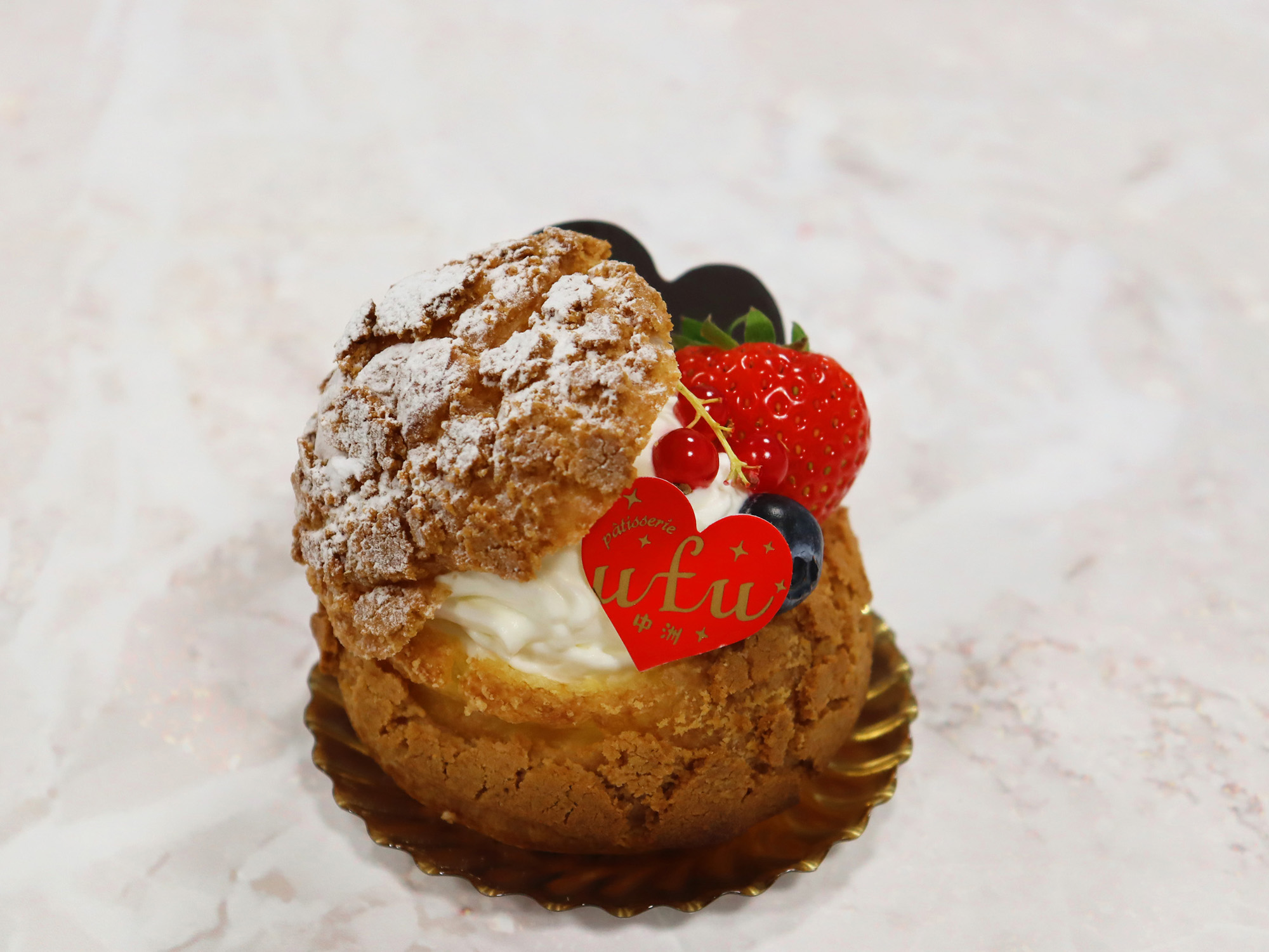 王道のシュークリームにフルーツを添えて華やかに仕上げました。
